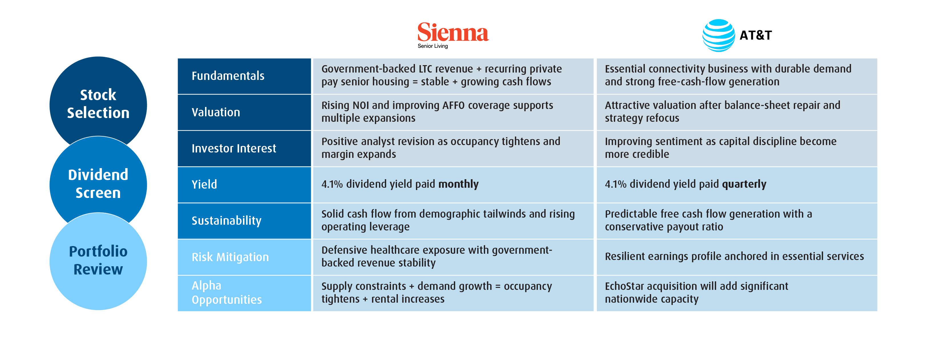 To bring the enhanced methodology to life, Chart 5 highlights two examples of stocks selected through BMO’s rules‑based framework. Sienna Senior Living (Ticker: SIA), a constituent in BMO Canadian Dividend ETF (Ticker: ZDV), and AT&T (Ticker: T) a constituent in BMO US Dividend ETF (ticker: ZDY). Both offer attractive yield at 4.1% while meeting the disciplined, quality-centred stock selection criteria.