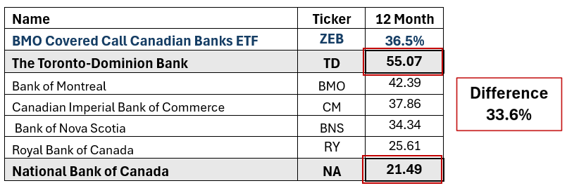 Investors may consider buying BMO’s bank ETFs given the wide performance dispersions between individual Canadian banks of late (see table below). One may have the opinion that not all banks are considered equal. Indeed, the dispersion is illustrated in the performance spread between TD and National Bank, which was as wide as 33% over the last 12 months. 3 BMO’s equal weight strategy is designed to remove concentration risk in a particular stock. The recent volatility among certain individual Canadian banks, has helped highlight the more stable returns from ZEB and ZWB2 which hold all names across the sector equally, thereby smoothing out total performance