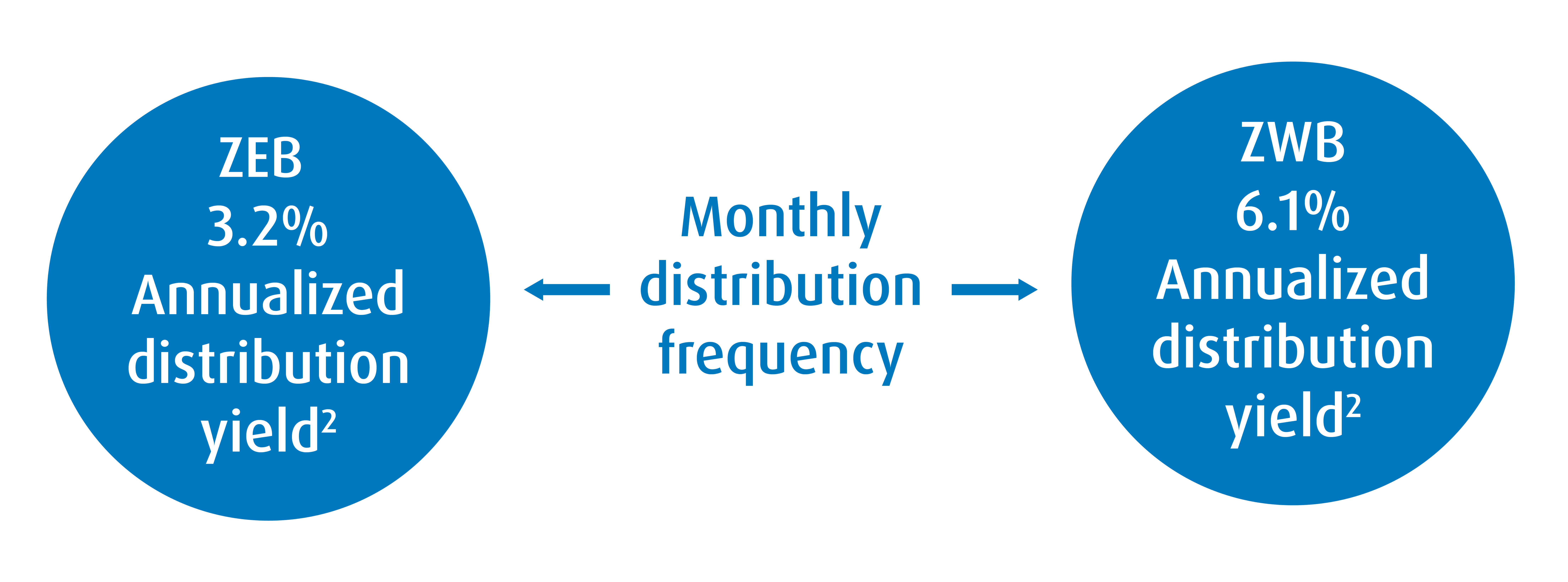 Historically, Canadian banks are known for steady and attractive dividends, which have continued to rise over time, which bodes well for income seeking investors. Equal weight bank ETFs capture dividends from all holdings, creating competitive cash flow for investors. ZEB and ZWB boast annualized distribution yields of 3.2% and 6.1%, respectively.2 Furthermore, it is important to note that instead of receiving quarterly dividends (as one would with holding bank stocks individually), when investing in ZEB and ZWB, investors are able to benefit from the consistent monthly distributions they provide.