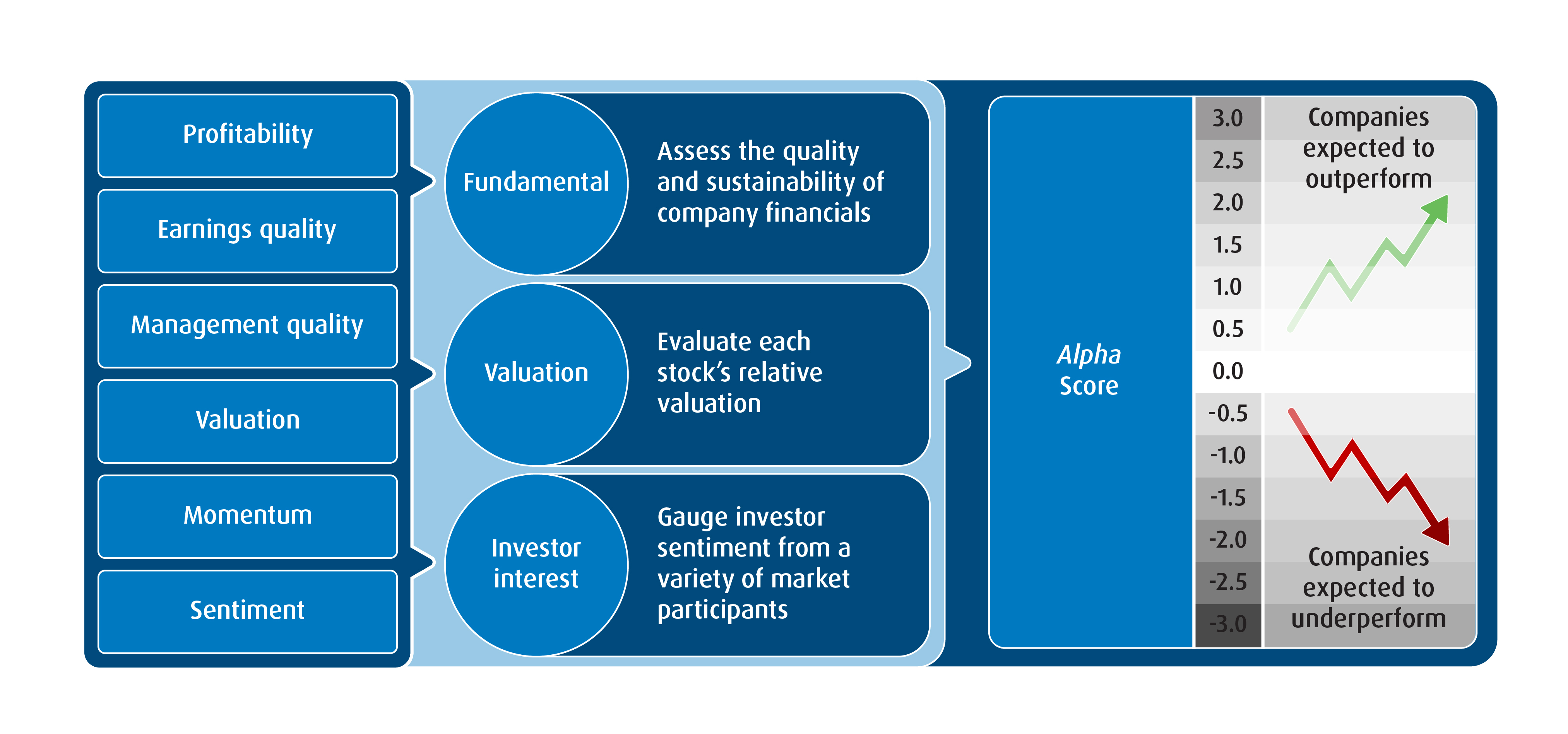 Each security in the investable universe is evaluated across a diversified set of factors that our research has shown to be associated with long-term outperformance. These include profitability, earnings quality, management quality, valuation, momentum, and investor sentiment. The result is a composite alpha score that ranks companies from most to least attractive.
