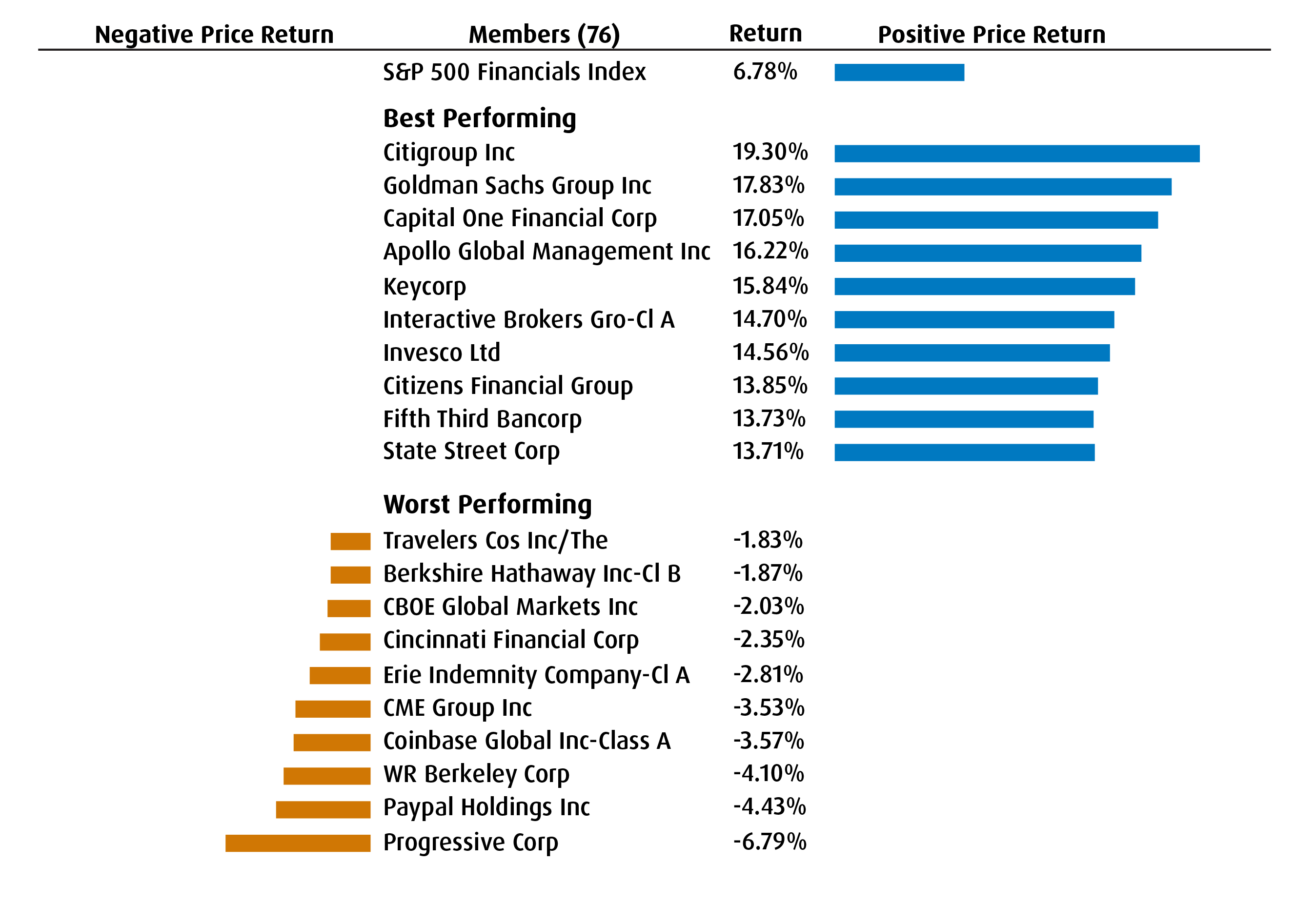 - We’re already overweight Financials. This has continued to be an attractive sector, given strong performance, while valuations remain reasonable relative to other sectors (forward P/E is 18.3). Participation is broad-based across banks, insurers, and diversified financials, which suggests strength beyond a few large-cap names (Chart 3).