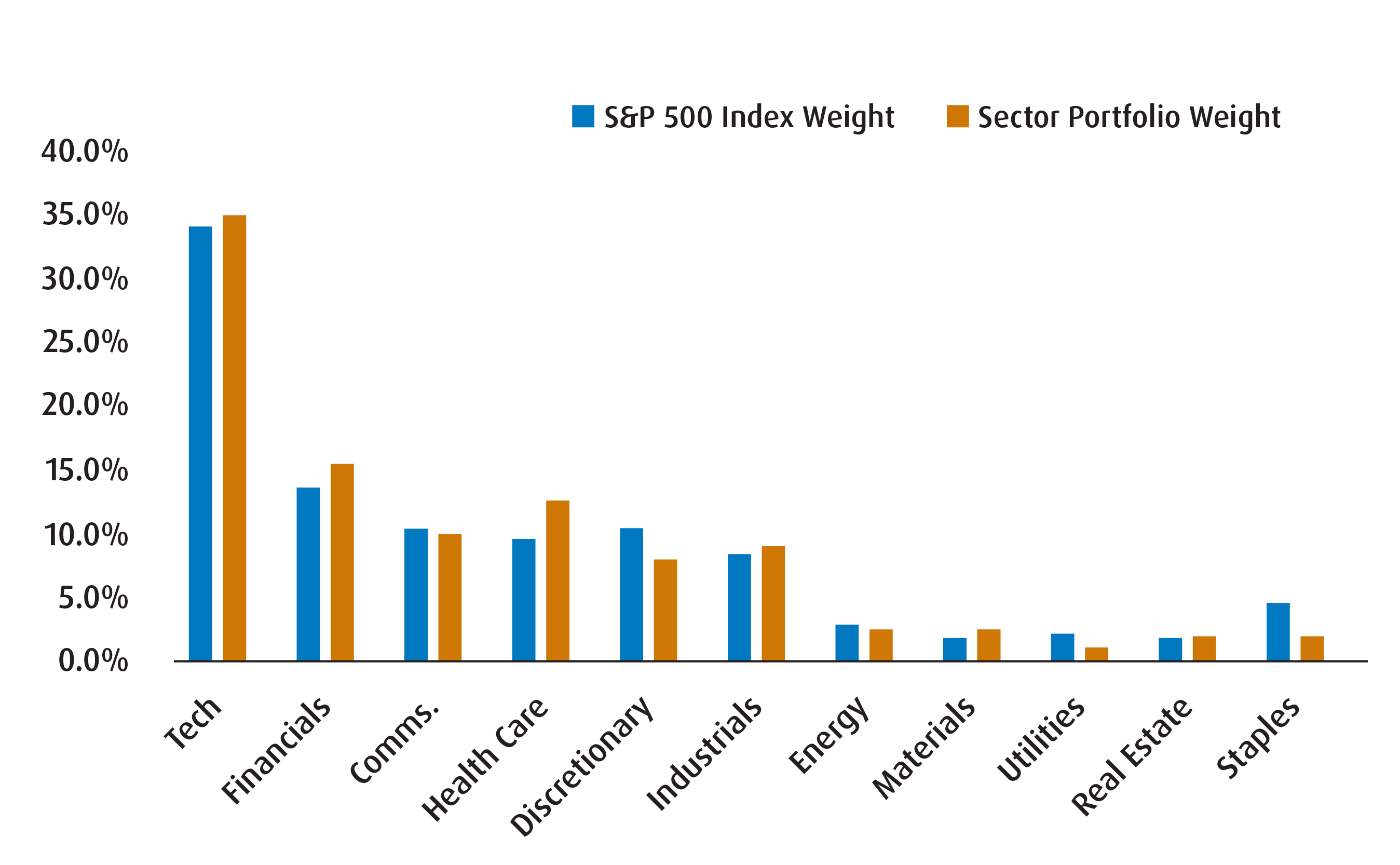 | Health care | 9.65% | 12.50% | 2.85% | Overweight | 0.50% |