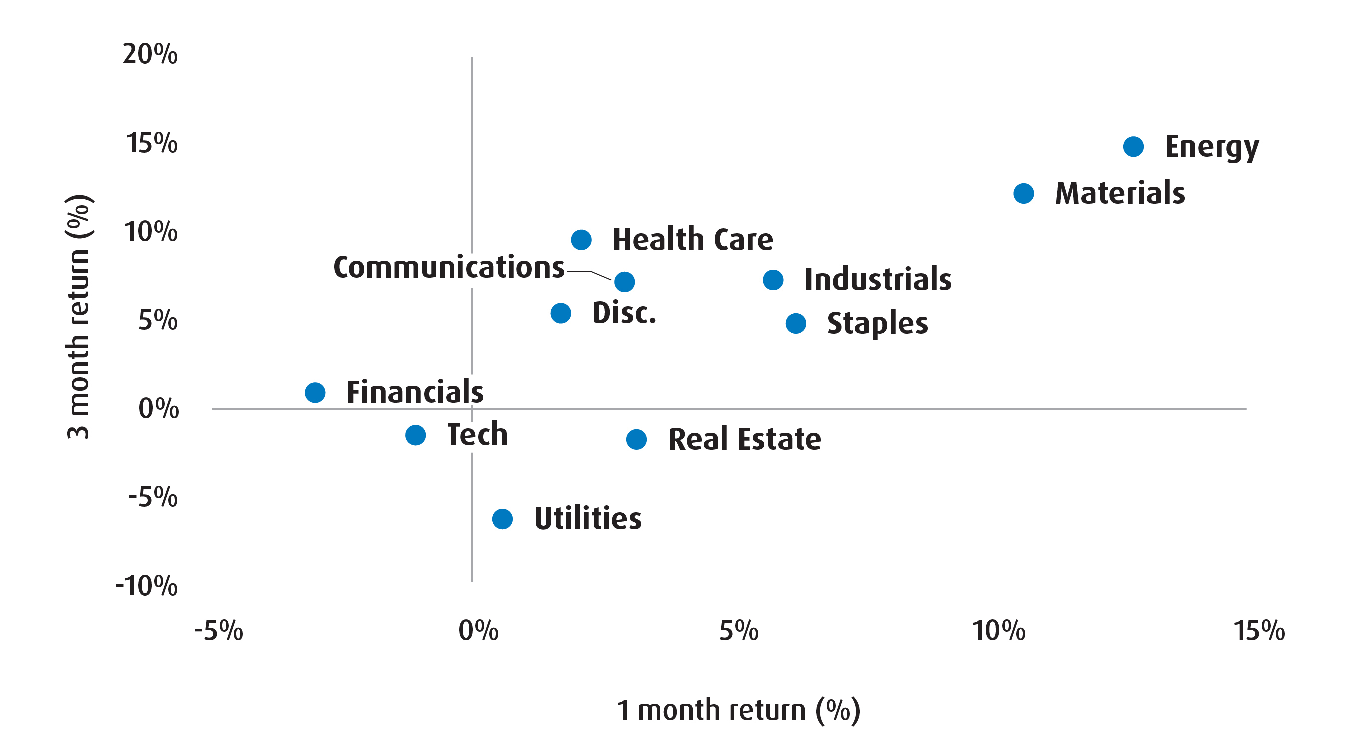 - Chart 1 captures the rotation clearly. Energy leads with strong return momentum across both one‑month and three‑month horizons. Materials and Industrials follow with similarly robust positioning, supported by infrastructure‑driven demand. Health Care and Communications Services also sit firmly in positive territory, underscoring their consistency as the market transitions toward more widely distributed leadership.