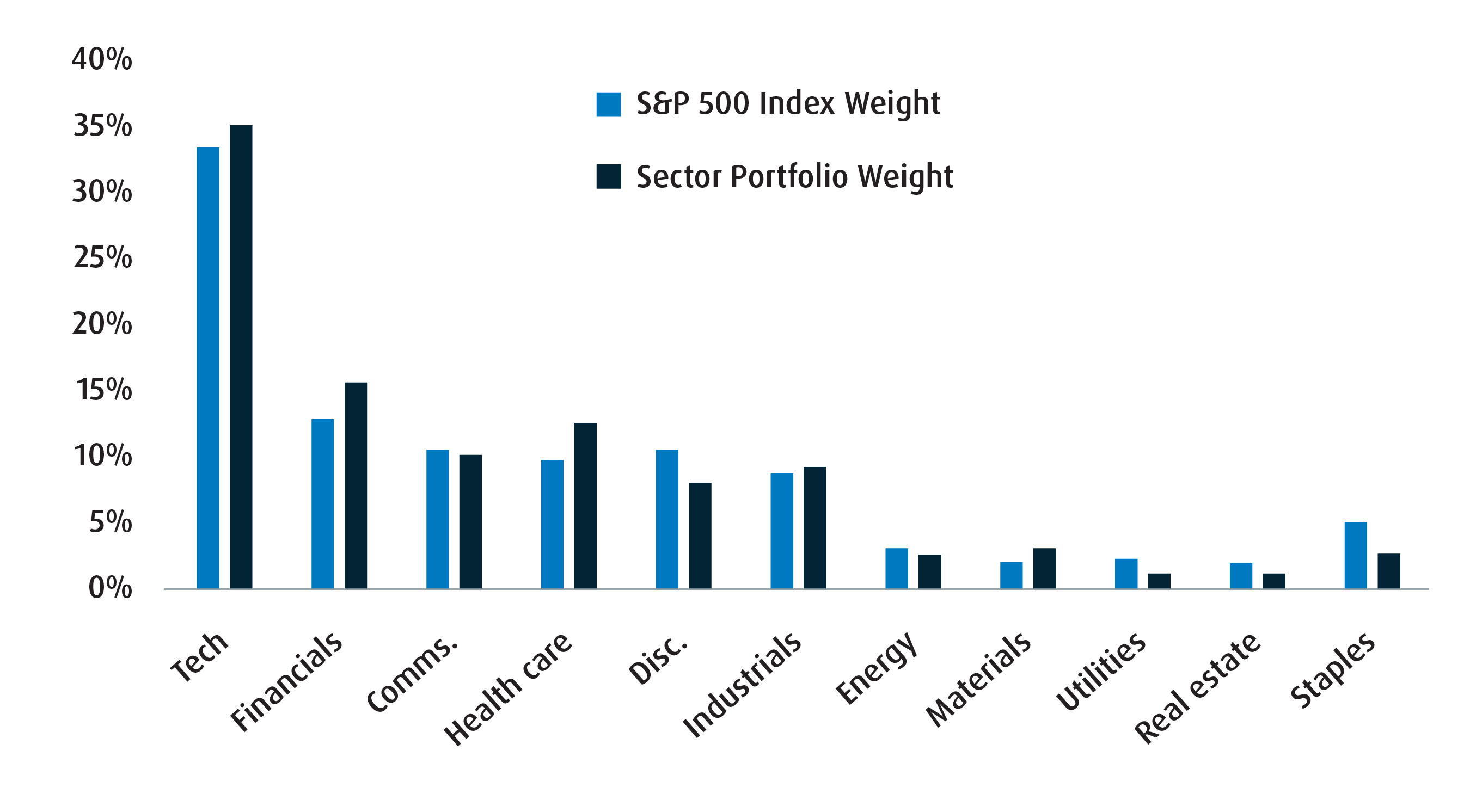 | Tech | 33.45% | 35.00% | 1.55% | Overweight | 0.00% |