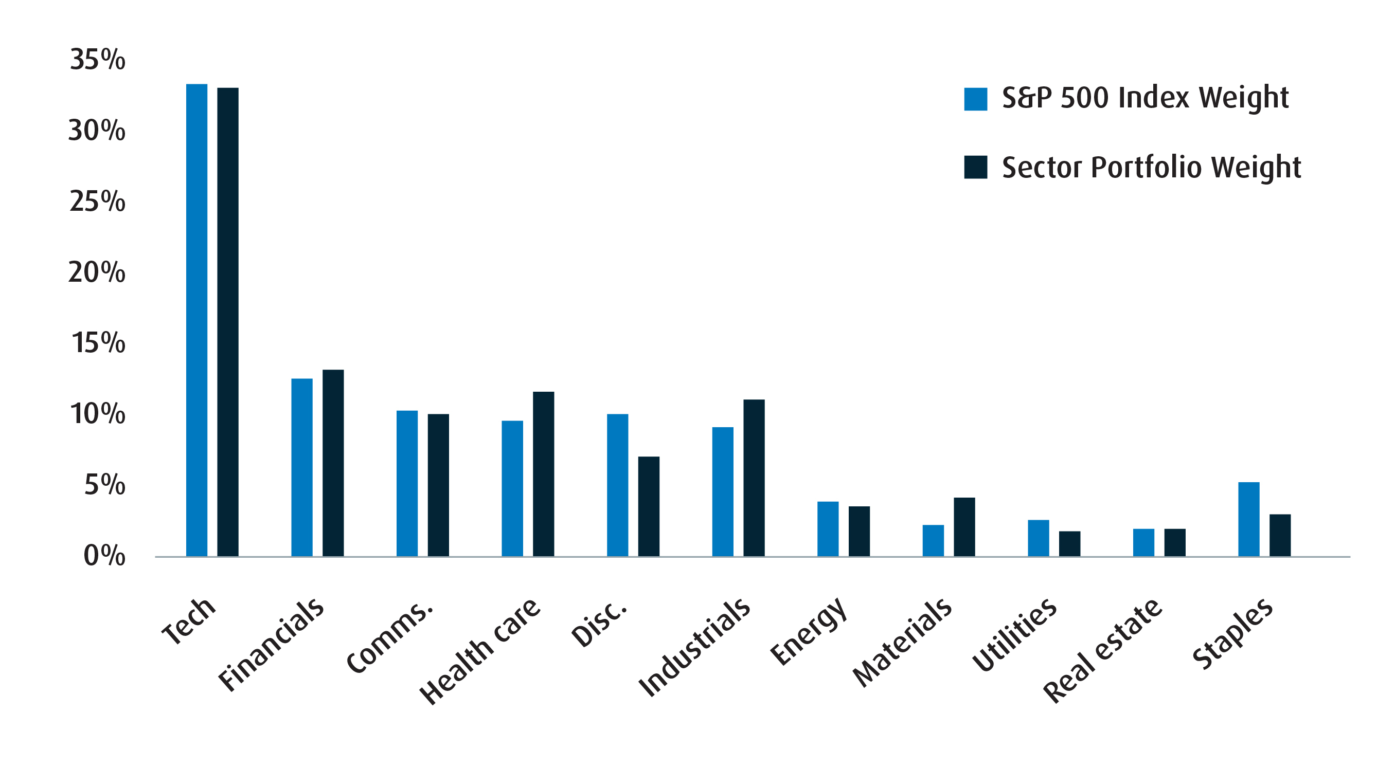 - Energy: Our position is still neutral, but weight is slightly higher than last month to be in line with index weight.