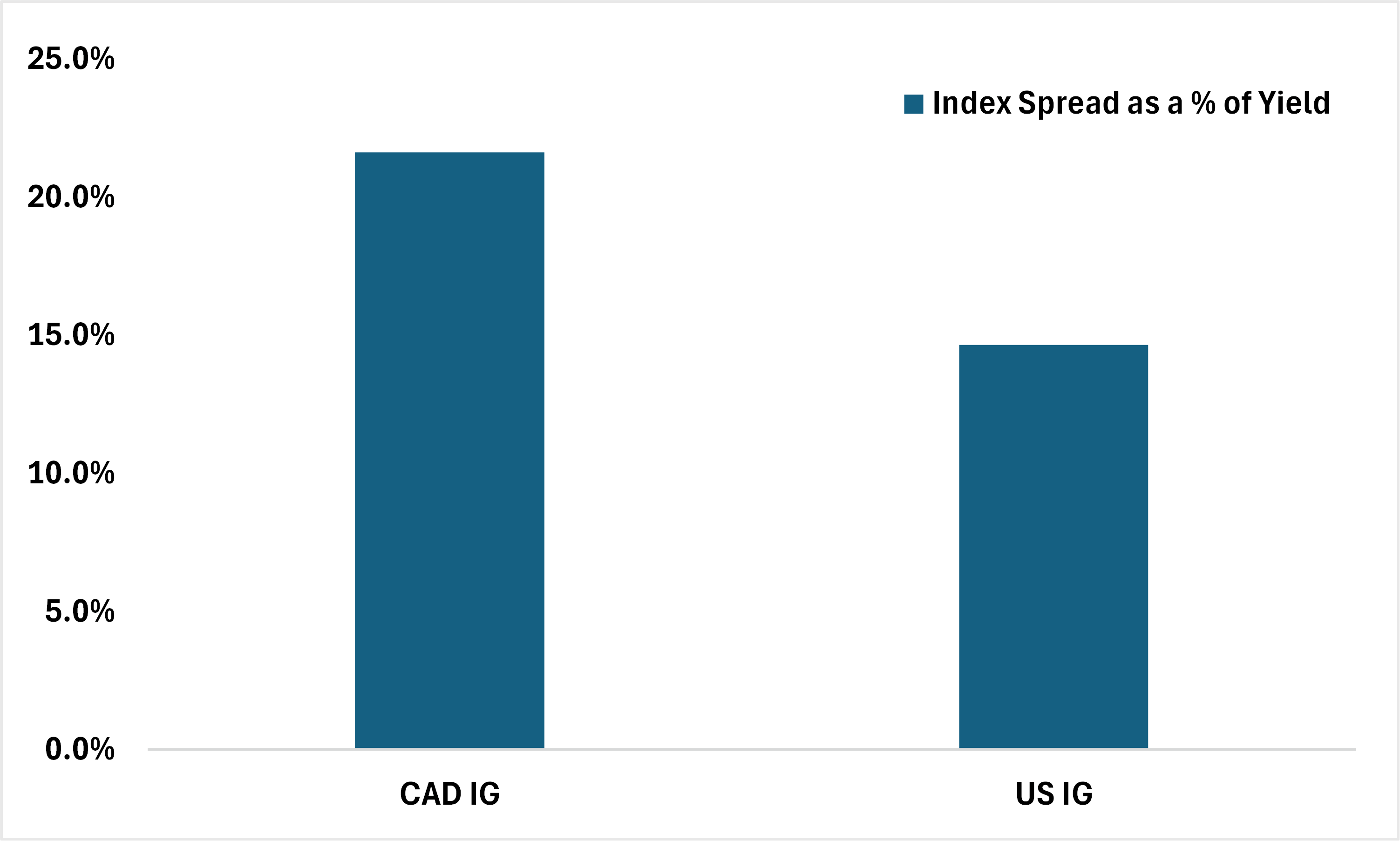One way to capture this is to normalize current spreads relative to the yield provided. This ratio tells us how much of the index yield is coming from credit risk relative to ‘risk-free’ rates. For the CAD Index, that ratio is about 22% - which is higher than it is for the US Index (15%).