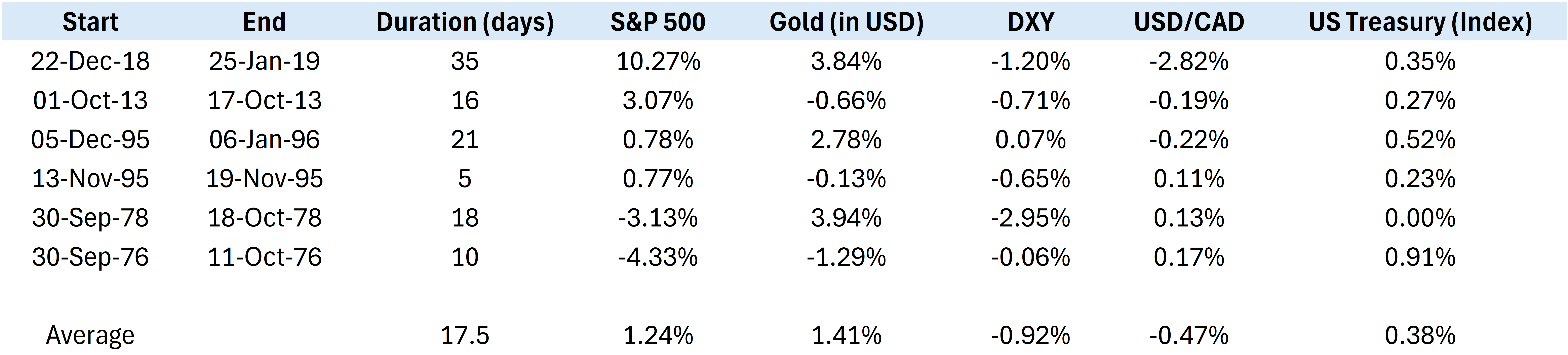 - Outside of short-term gyrations, we don’t see this as a material market driver. That is primarily because government shutdowns don’t typically last that long. For instance, from Table 1, we can see that prior shutdowns averaged just over two weeks.