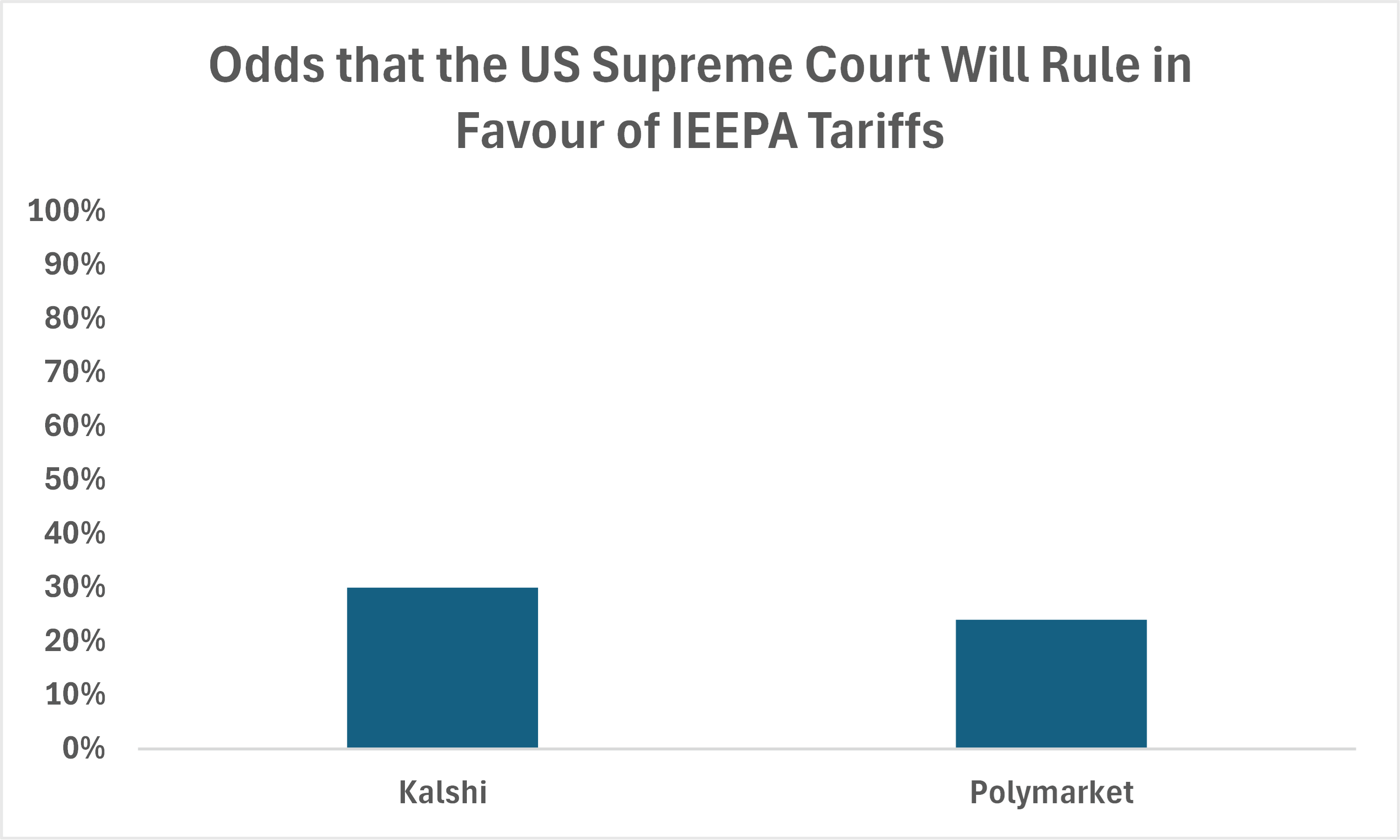 Chart 1 – Prediction markets expect the Supreme Court to strike down IEEPA