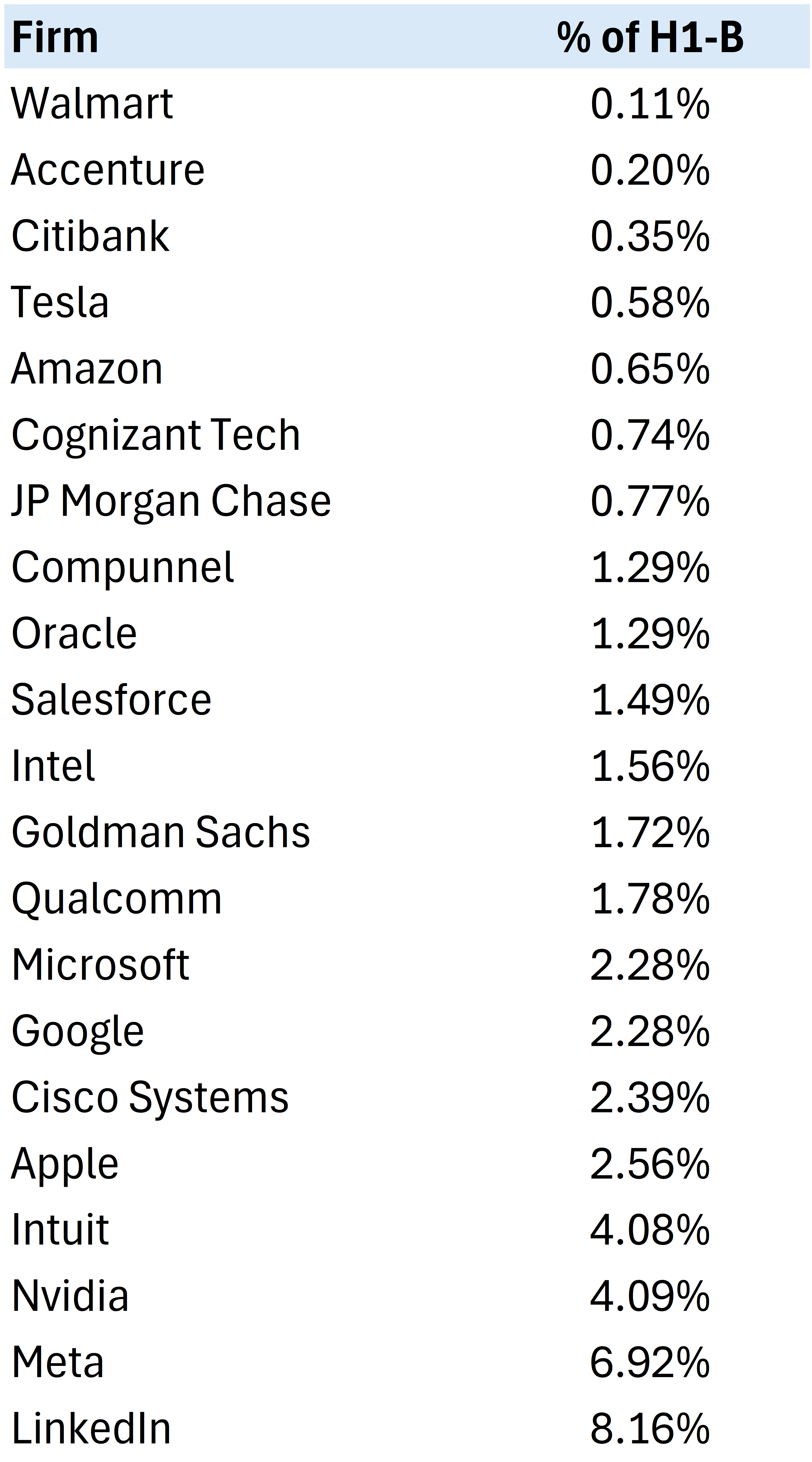 Table 1 – Percentage of Labor Force with H1-B Visas for Top Applicant Firms