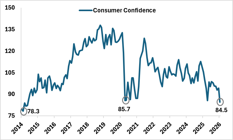 January 30, 2026Consumer confidence in the US has fallen to its lowest level since 2014, which could be another harbinger of late‑cycle dynamics. Sentiment surveys tend to get noisy at this stage, weighed down by inflation fatigue, higher rates and political uncertainty. But despite the gloom, consumer spending level tell a different story. Wage growth is still positive, real disposable income is improving, and which points to a still decent profile for consumption.