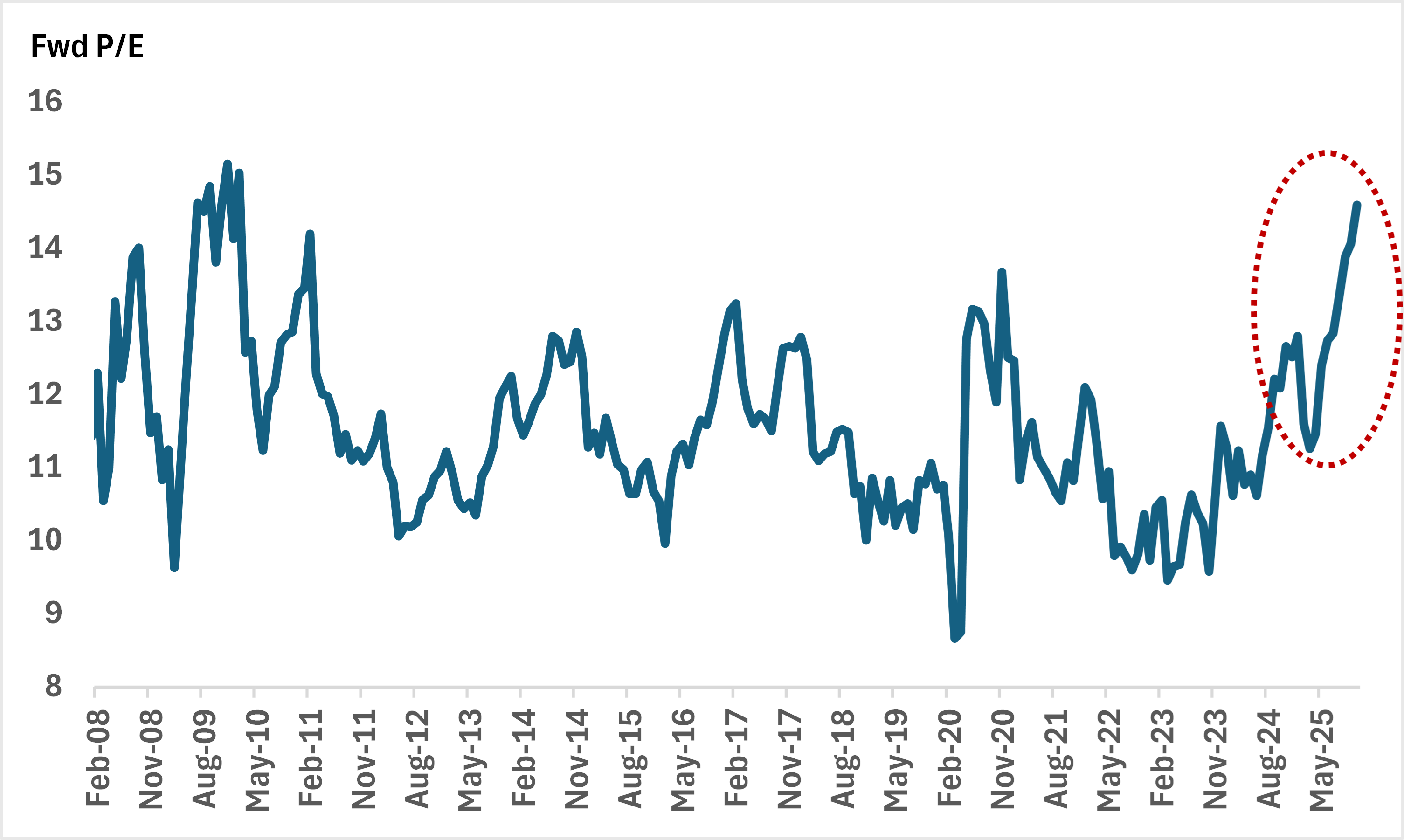 Outside of tech, two sectors that we feel are best positioned are US healthcare and financials. In particular, healthcare has emerged as an effective hedge against AI-related concerns. The sector is still a bit ‘cheap’ as well, which has also worked to support its performance over the past months.