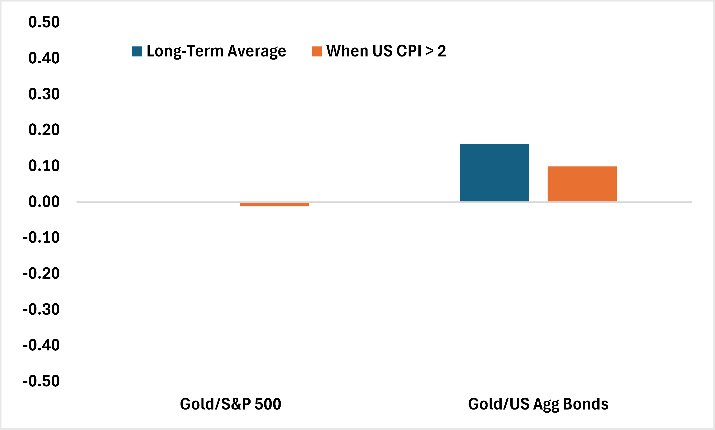 Additionally, the benefits of holding Gold as a diversification instrument are also well understood by now. Consider Chart 2 which shows that regardless of whether we’re in a period of high inflation not, the degree of correlation between Gold and stocks/bonds tends to be low. This means that increased allocation to Gold will usually result in lower overall volatility for the portfolio.