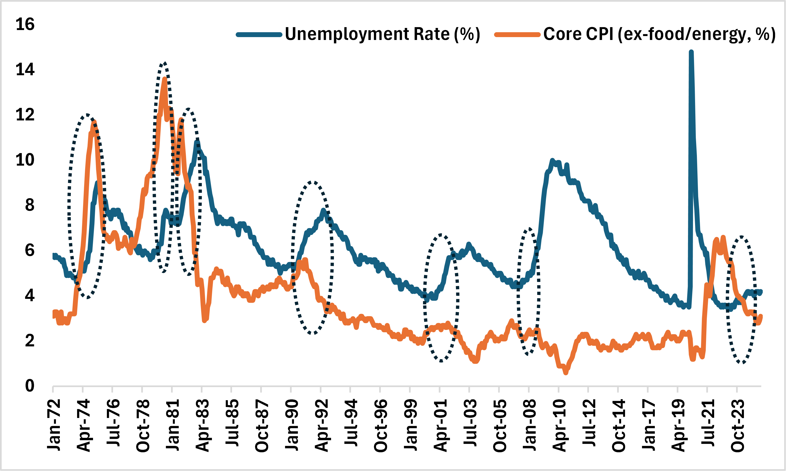 *The dotted circles in the above chart corresponds to periods where the unemployment rate rose by 0.5% over 12 months on a rolling basis and where core CPI was above 2.5%
