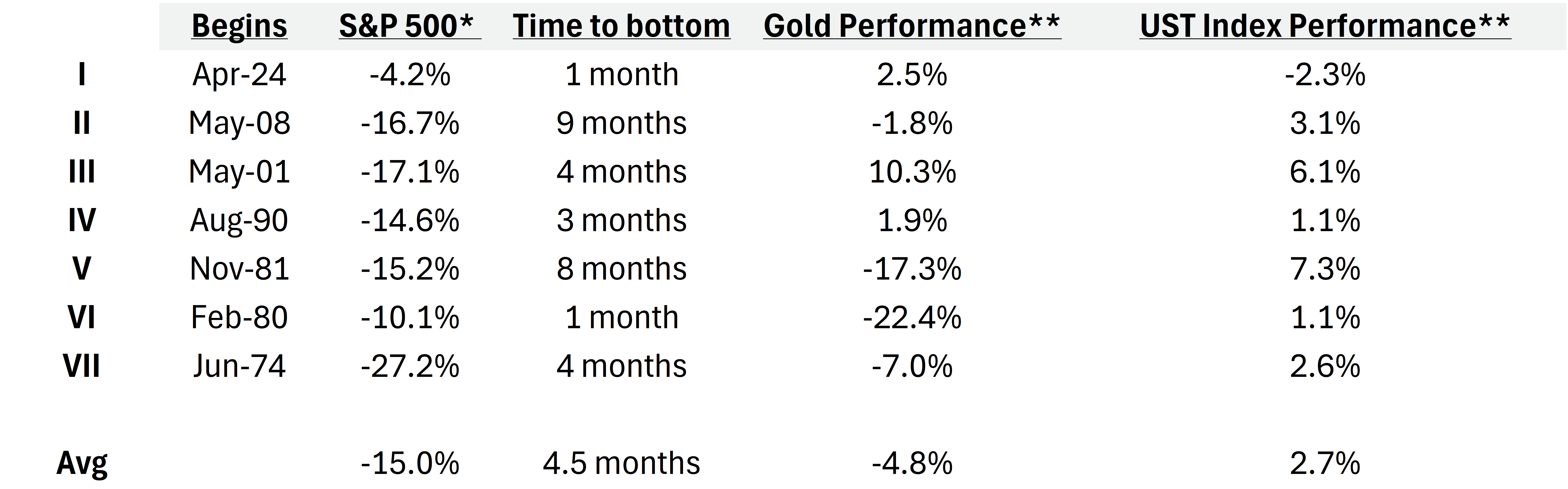 Admittedly, the one observation that we were surprised to see was the outperformance of indices that tracked US Treasuries over those same periods. We’d chalk that up to structural factors (namely, the 40-year bullish market for bonds) that are far less a tailwind these days. For example, the last observation period is 2024 – and bonds underperformed relative to Gold.