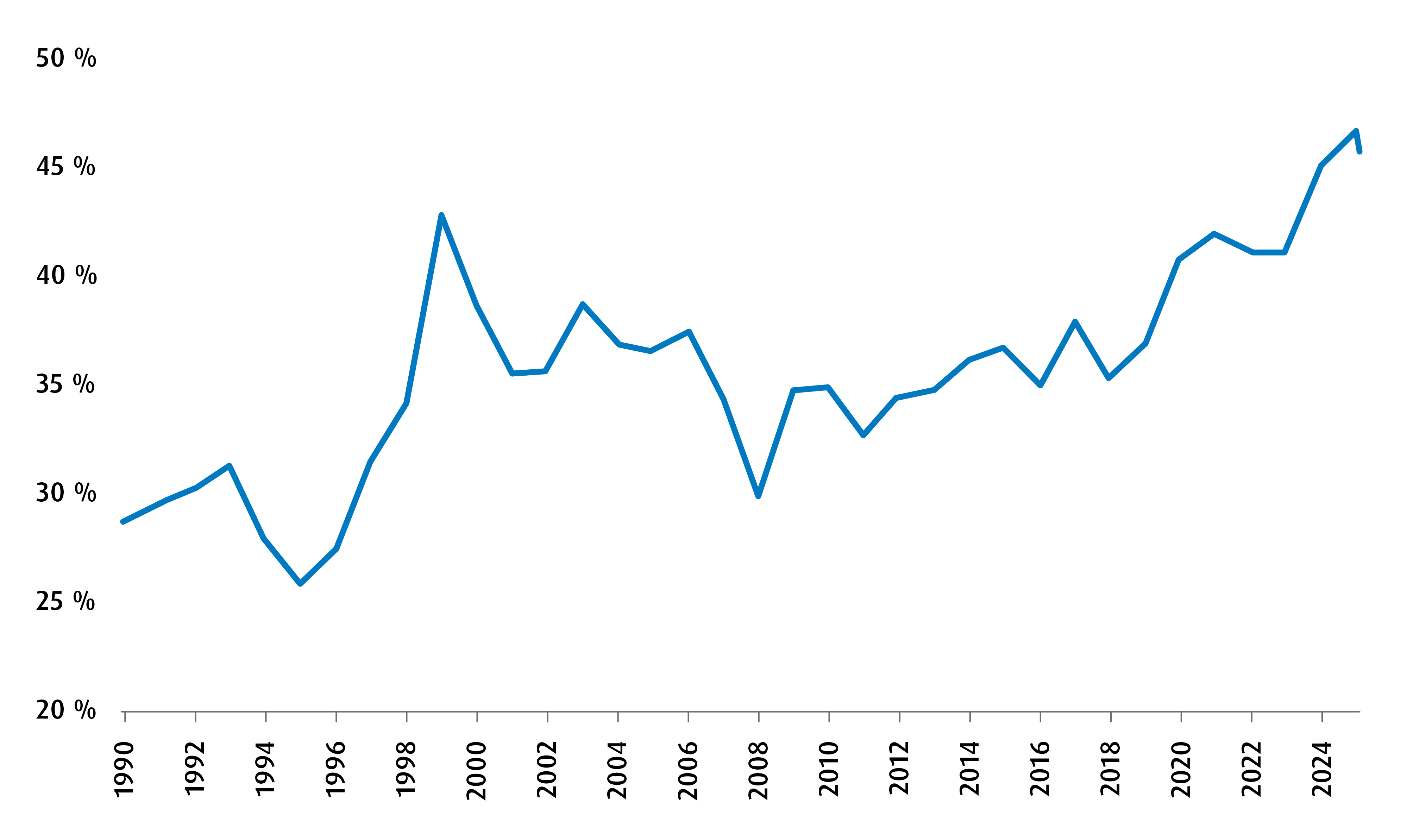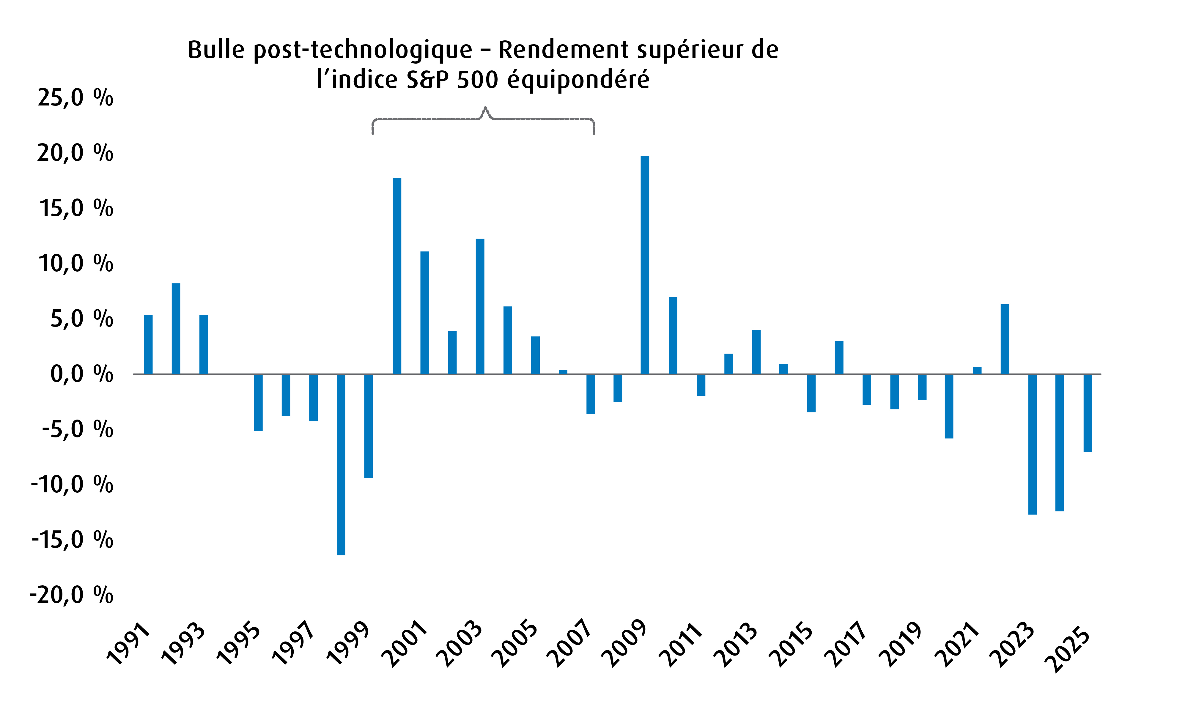 En ce qui concerne les précédents historiques, le graphique 2 aide à définir les attentes. Dans les années qui ont suivi la bulle technologique, l’élan des bénéfices s’est généralisé, le peloton de tête du marché s’est élargi et les indices américains équipondérés ont inscrit des rendements supérieurs. Tous ces éléments s’harmonisent bien avec un thème clé que nous avons souligné dans nos récents travaux : l’élargissement de la participation et l’augmentation du nombre de meneurs du marché dans les actions américaines en 2026.