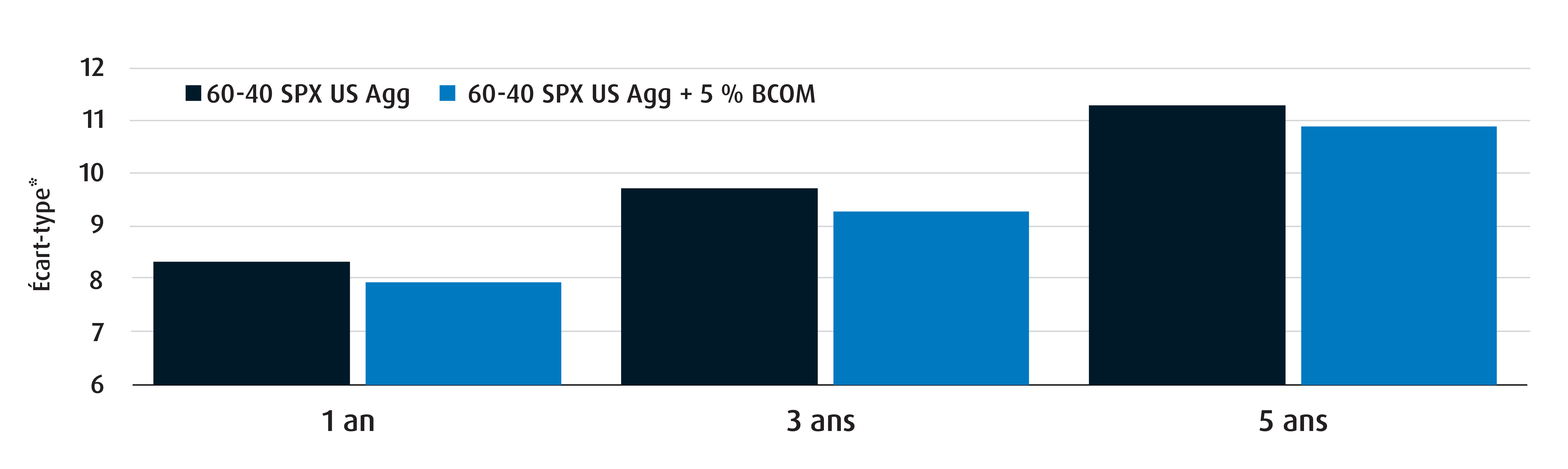 L’un des facteurs les plus importants à notre avis est le peu de capital requis pour améliorer les résultats du portefeuille. Le graphique d’écart-type (graphique 3) montre que l’intégration d’une pondération de 5 % en produits de base dans un portefeuille 60/40 traditionnel peut réduire la volatilité sur des horizons d’un, trois et cinq ans, selon les données historiques.