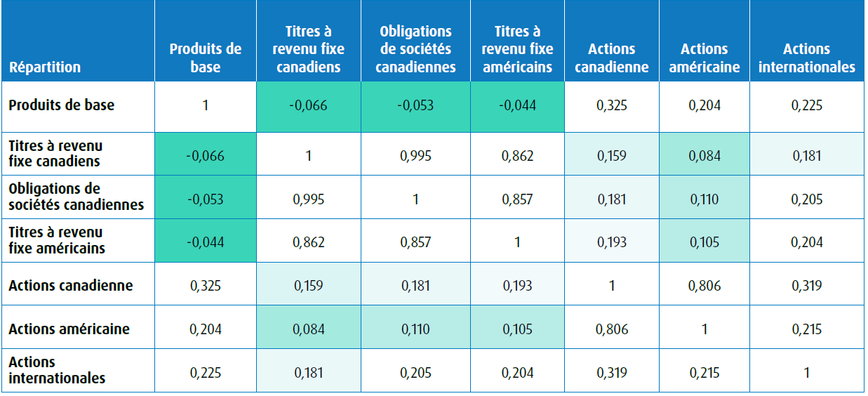 Au cours des cinq dernières années, les expositions générales aux produits de base ont affiché des corrélations faibles à négatives tant avec les actions qu’avec les titres à revenu fixe, contrairement au comportement de plus en plus synchronisé des actions et des obligations (tableau 1).