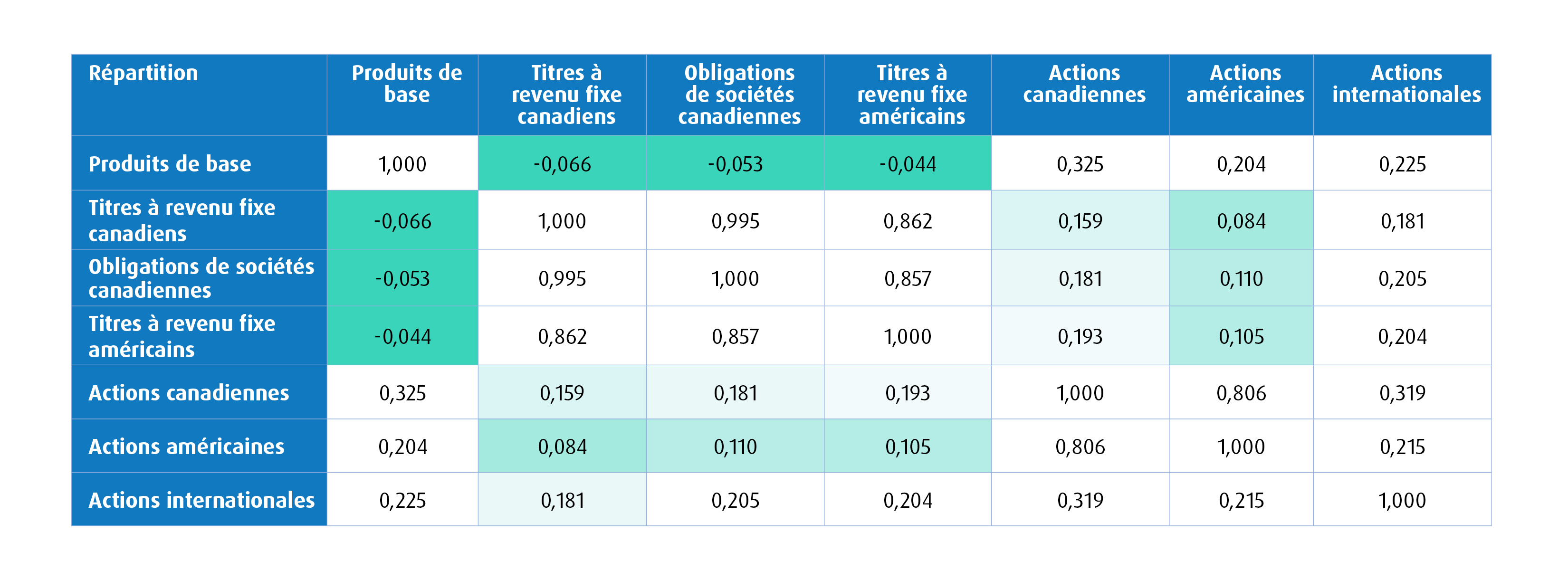 L’ajout de FNB de produits de base à un portefeuille peut aider les investisseurs à tirer parti de nouvelles occasions tout en renforçant la diversification. Comme le montre le tableau ci-dessous, les produits de base présentent une corrélation faible à négative avec les actions et les obligations.