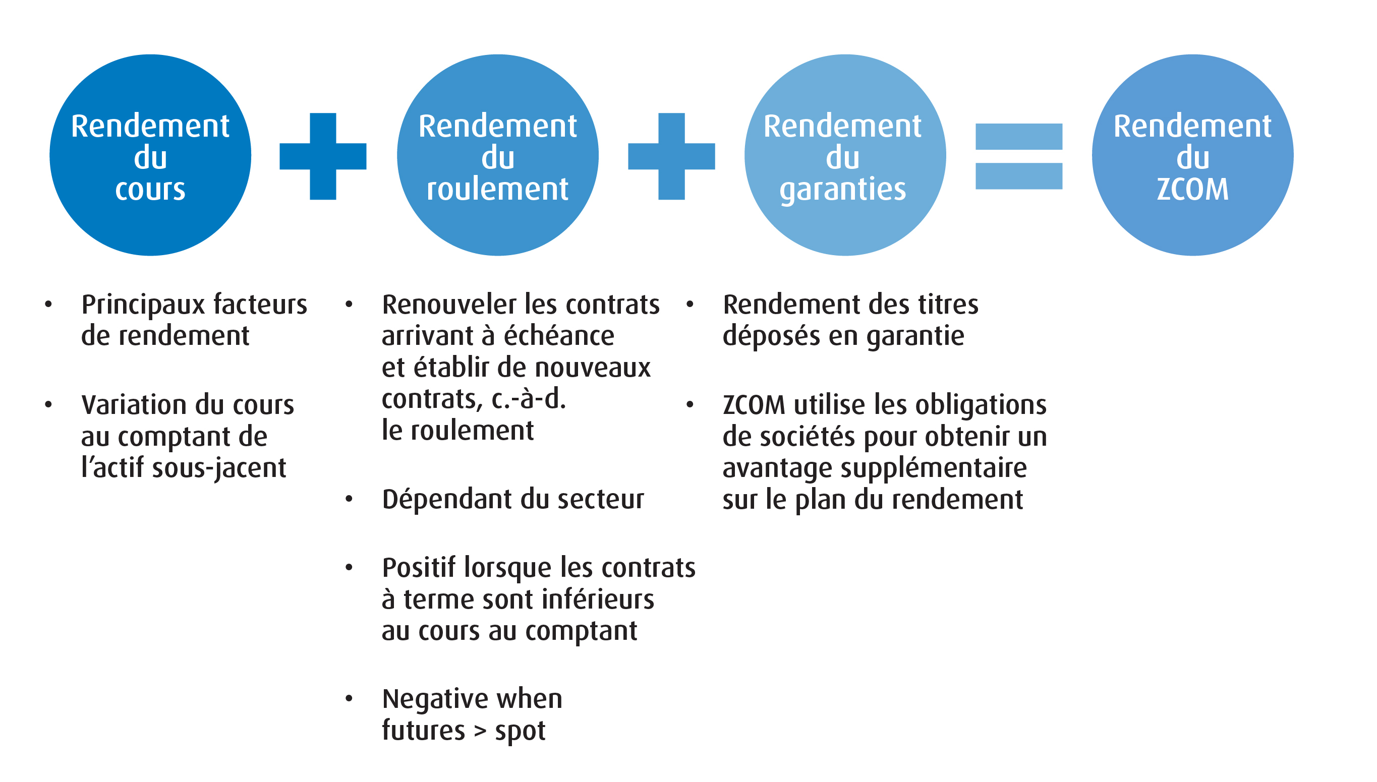 De plus, la structure de rendement du ZCOM est diversifiée. Les principaux facteurs de rendement sont les prix des produits de base, mais les investisseurs peuvent également bénéficier de deux autres composantes : le rendement de roulement, qui découle de la clôture et de l’établissement de nouveaux contrats à terme standardisés2, ainsi que le rendement des garanties. ZCOM utilise des obligations de sociétés américaines de grande qualité à très court terme pour générer potentiellement un rendement supplémentaire supérieur à celui des obligations du Trésor américain.