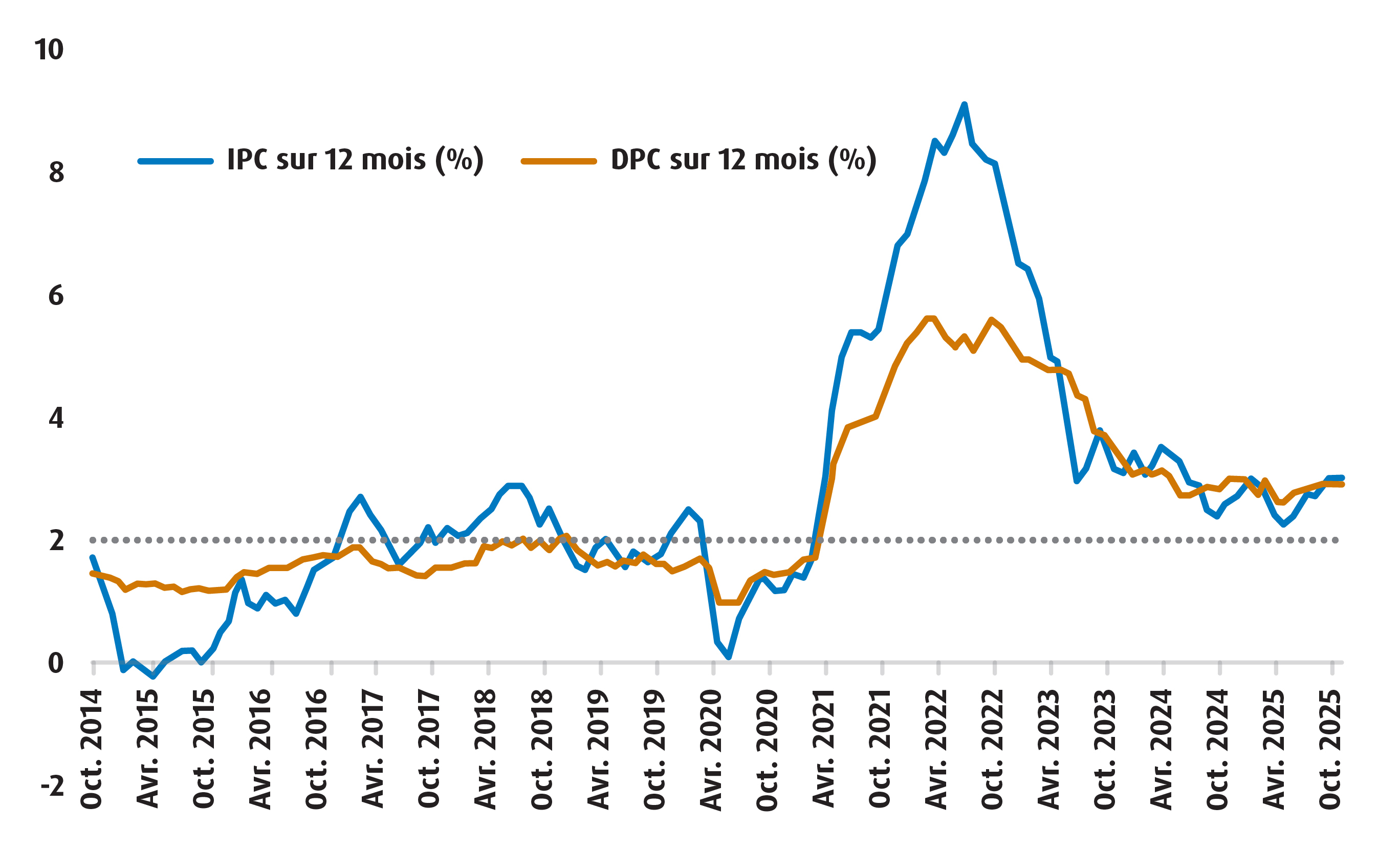 Le Bureau of Labor Statistics (BLS) a annulé la publication de l’indice des prix à la consommation (IPC) d’octobre, mais il est peu probable que cela aurait fourni une preuve définitive que la Fed fait des progrès par rapport à son mandat sur l’inflation. L’IPC et les DPC (une autre mesure clé de l’inflation3) se rapprochent actuellement de la barre des 3 % plutôt que de la cible de 2 % (graphique 2). De plus, les attentes des ménages à l’égard de l’inflation à long terme sont encore un peu trop élevées pour les rassurer. La théorie classique proposerait que la Fed doive maintenir les taux au même niveau à ce stade-ci.