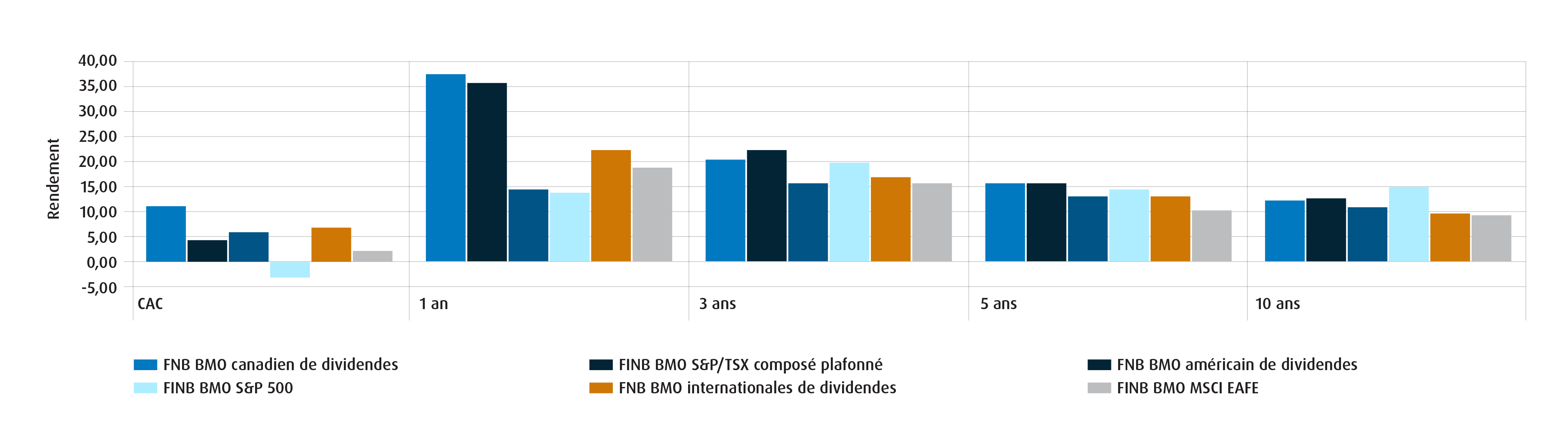 Les placements dans des fonds négociés en bourse peuvent comporter des frais de courtage, des frais de gestion et d’autres frais. Veuillez lire l’Aperçu du FNB ou le prospectus des FNB BMO avant d’investir. Les taux de rendement indiqués sont les taux de rendement composés annuels historiques globaux; ils tiennent compte de l’évolution du prix des parts et du réinvestissement de tous les montants distribués, mais non des commissions ni de l’impôt payables par le porteur de parts, lesquels auraient réduit le rendement. Les fonds négociés en bourse ne sont pas garantis, leur valeur fluctue fréquemment et leur rendement passé n’est pas indicatif de leur rendement futur.