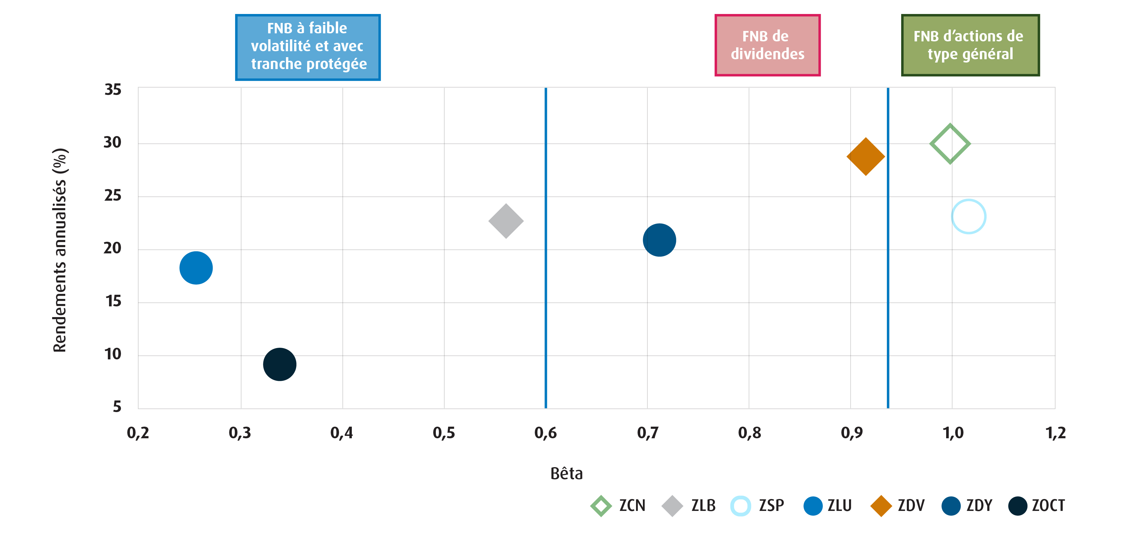 Remarque : Le ZCN, le ZLB et le ZDV affichent un bêta par rapport à l’indice composé S&P/TSX. Le ZSP, le ZLU et le ZDY calculent le bêta par rapport à l’indice S&P 500 en dollars canadiens, et le ZOCT calcule le bêta par rapport à l’indice S&P 500 couvert en dollars canadiens.