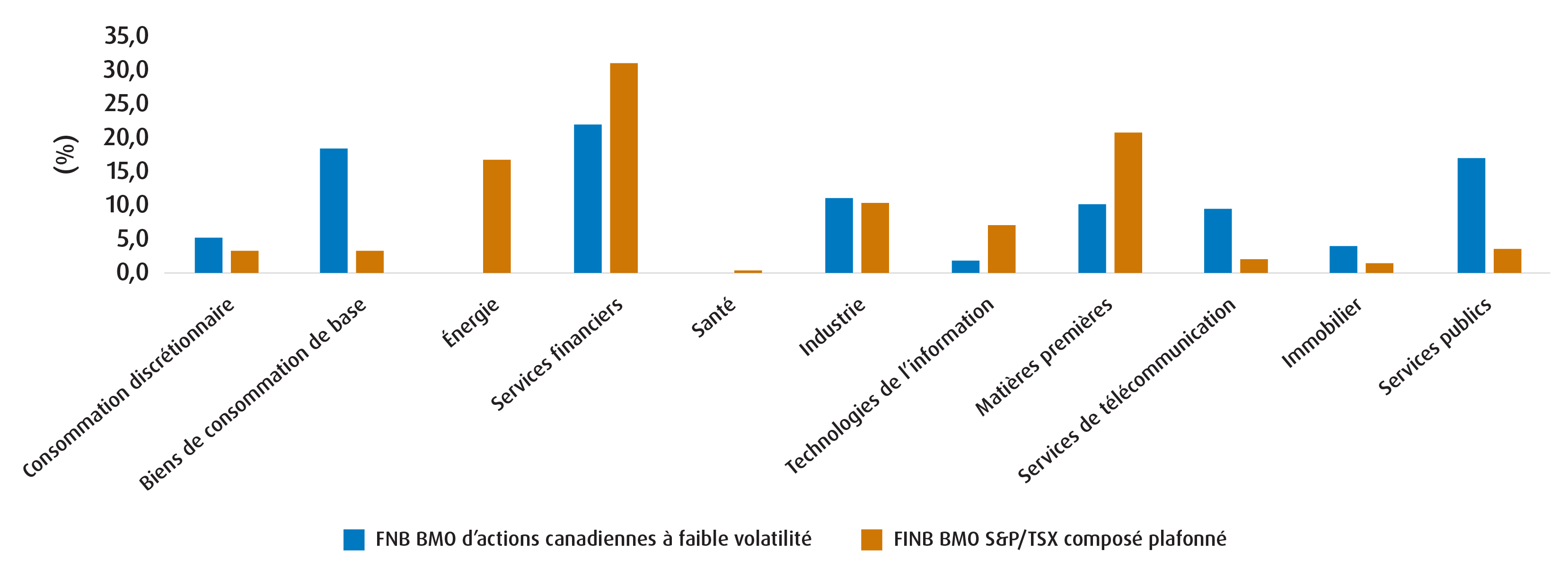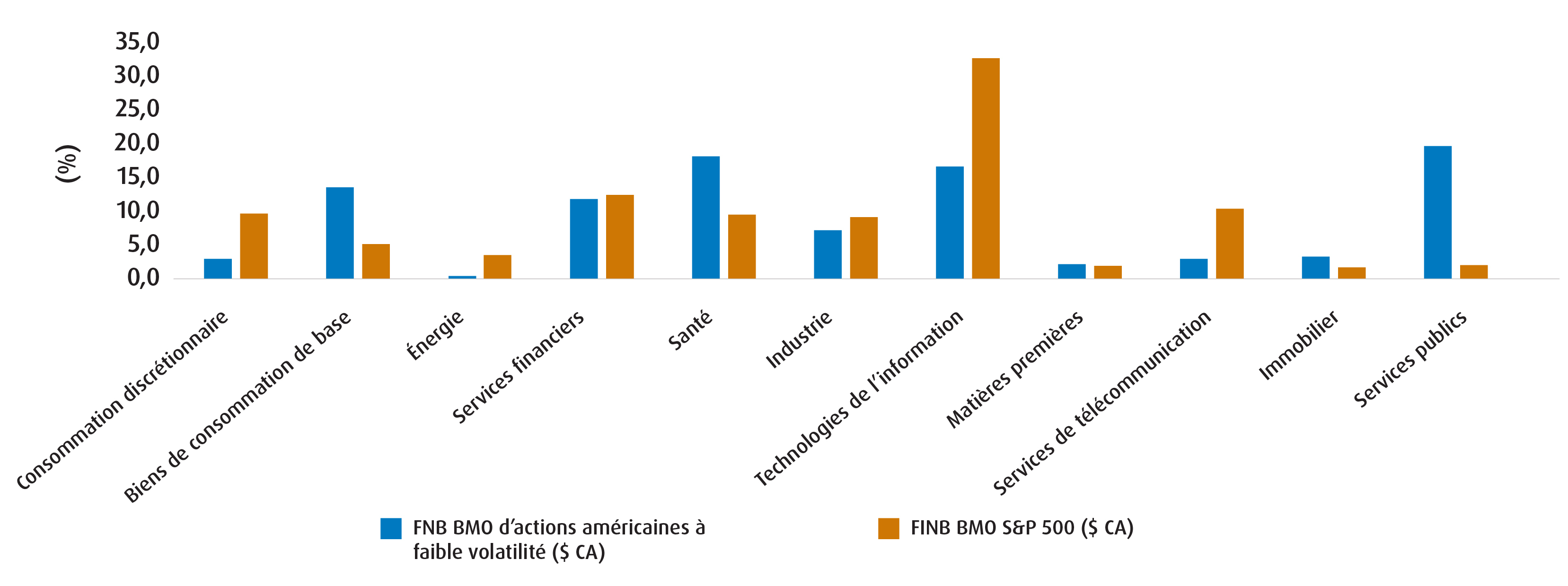 Les FNB d’actions à faible volatilité de BMO cherchent à réduire les fluctuations du portefeuille en investissant dans des actions qui, par le passé, ont été moins sensibles aux mouvements du marché. BMO utilise un processus de sélection fondé sur le bêta, classe les actions selon le bêta historique par rapport au marché et construit des portefeuilles avec des titres à bêta faible, tout en imposant des contraintes sectorielles et individuelles aux titres afin d’éviter une concentration excessive. En raison de la méthode de sélection, ces FNB ont tendance à privilégier les secteurs plus défensifs.